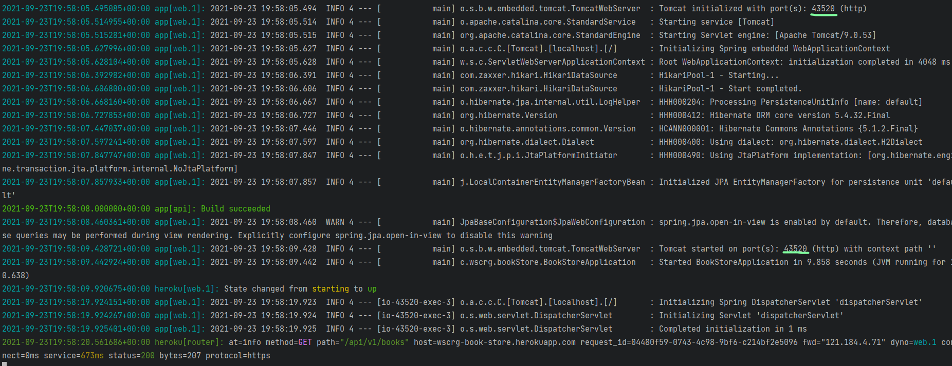 이렇게 설정하고 heroku 로그를 확인해보면 서버 포트는 8080으로 바뀌어 있지 않은 것을 확인할 수 있다.