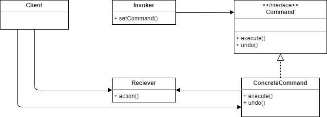 Client: 구현된 커맨드(ConcreteCommand)를 생성하고Reciever를 지정한다.Receiver: 실제 동작을 수행하는 객체이다.ConcreteCommand: 인보커에서 execute() 호출을 통해 요청을 하면ConcreteCommand객체에서 리시버에 있는 메서드를 호출함으로써 그 작업을 처리한다.Command: 모든 커맨드 객체에서 구현해야 하는 인터페이스이다. 모든 명령은execute()로 수행되며, 이 메서드에서는 리시버에 특정 작업을 처리하라는 지시를 전달한다.Invoker: 필요한 작업을 요청할 때 사용하는 객체이다.setCommand()의 인자로 실행할 커맨드 객체를 입력받고 나중에 실행 메서드를 통해 해당 커맨드를 실행한다.