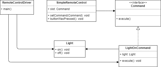 RemoteControlDriver: 클라이언트에 해당한다. 리시버와 구현 커맨드를 생성하고 인보커에게setCommand()를 통해 구현된 커맨드를 전달한다. 그리고 나중에SimpleRemoteControl(인보커)를 통해buttonWasPressed()를 호출하면Light(리시버)의 작업이 수행된다.Light: 리시버에 해당한다. 불이 실제로 켜지고(on) 꺼질 때(off) 수행할 동작을 알고 있다.LightOnCommand:Command인터페이스를 구현한 커맨드 객체이다. 이 커맨드에서execute()를 수행하면 생성자에서 인자로 받은light의on()메서드를 수행하도록 한다.Command: 모든 커맨드가 구현해야 할 인터페이스이다.SimpleRemoteControl: 인보커에 해당한다. 먼저 클라이언트로부터 커맨드를 입력받는다(setCommand()). 그리고 나중에 클라이언트가 동작(buttonWasPressed())을 요청할 때setCommand()로 입력받은slot의execute()를 수행한다.