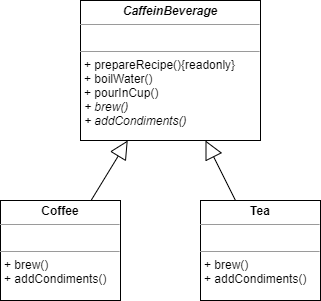 이렇게 바꿔놓고 보니 두 음료의 prepareRecipe()가 완전히 동일해진 것을 볼 수 있다. 이것도 추상화할 수 있을까? 물론이다. 방법은 매우 간단하다. CaffeinBeverage에서 이 메서드를 final로 선언하고 구현하면 된다.