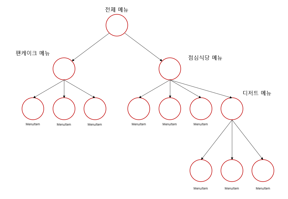 이터레이터 패턴에서 사용한 예시를 다시 써보자. 두 가게를 합병한 후로 장사가 탄탄대로를 달려서 이젠 점심 메뉴에 디저트 메뉴도 넣자는 기획이 들어왔다. 즉 점심 메뉴 안에 디저트 메뉴가 포함되는 것이다. 이러한 구조는 어떤 자료구조를 사용해야 할까? 메뉴 안에 메뉴... 트리 구조가 적당할 것 같다. 그림을 그려보면 대충 다음과 같다.