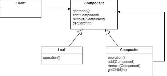 객체들을 트리 구조로 구성하여 부분과 전체를 나타내는 계층 구조로 만드는 패턴이다. 이 패턴을 이용하면 클라이언트에서 개별 객체와 다른 객체들로 구성된 복합 객체를 똑같은 방법으로 다룰 수 있다. 이번 예제에서는 Menu를 순회하면서 MenuItem에 접근하다가 Menu가 나오면 그 Menu를 다시 순회하며 MenuItem을 접근하는 방식으로 흘러간다. 이를 일반화하여 클래스 다이어그램으로 나타내면 다음과 같다.