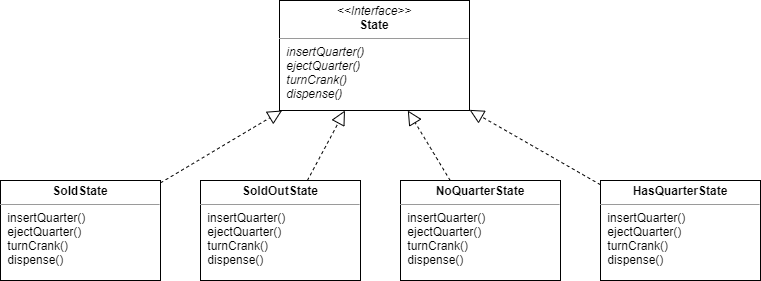 먼저 static 변수로 사용하는 것들을 State라는 인터페이스로 만들자. 그리고 각 상태를 State를 구현한 클래스로 사용해보자. 이를 바탕으로 클래스 다이어그램을 그리면 아래와 같다.