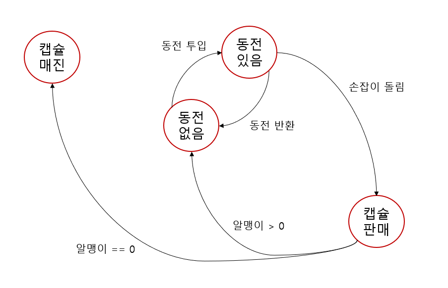 먼저 상태를 살펴보자. 동전이 없는 상태, 있는 상태, 캡슐이 판매된 상태, 매진된 상태가 있다. 이를 클래스 변수로 만들면 다음과 같다.