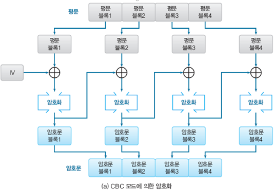 - 맨 처음 수행하는 암호문 블록은 초기화 벡터(Initialization vector, IV)를 사용한다.