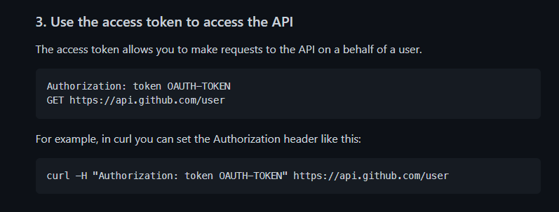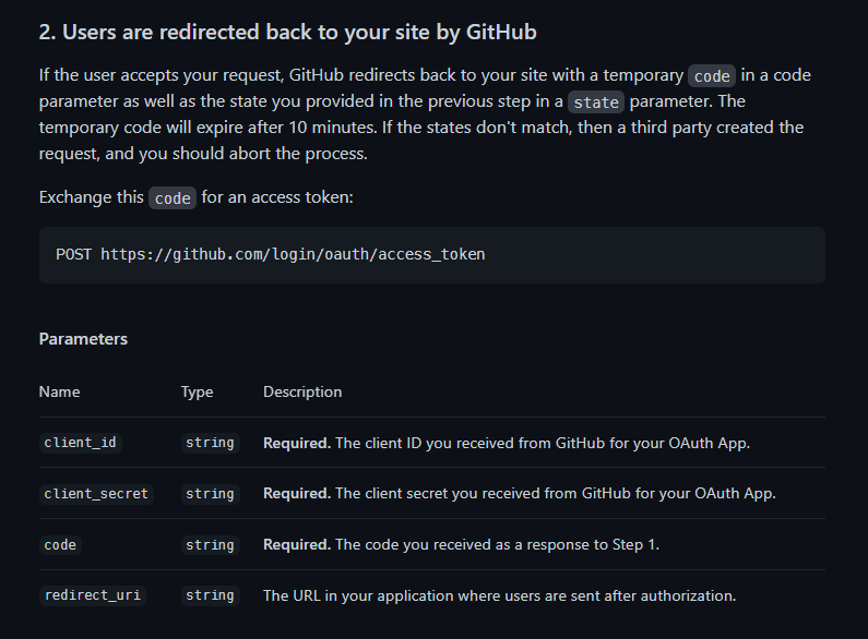 이제 두 번째 단계를 확인하자. 여기서는 POST 방식으로 아래 링크에 파라미터로 client_id, client_secret, code 값이 필수로 되어있다. 이 단계를 성공하면 우리 깃허브 계정에 대해 접근할 수 있는 access token이 발행된다.