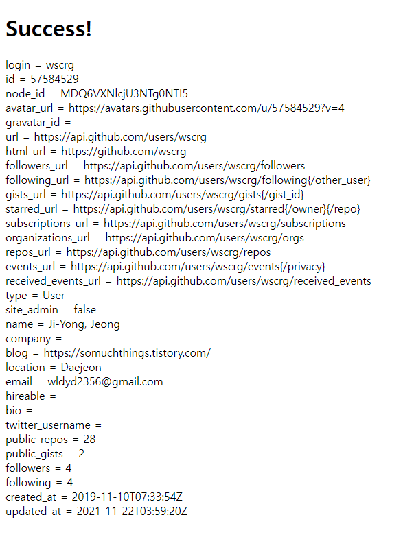 드디어 OAuth를 통해서 바라던 계정 정보를 가져왔다. 이를 브라우저로 출력해보자. 먼저 완료 페이지인 success.html을 resources/template 아래에 작성하자.
