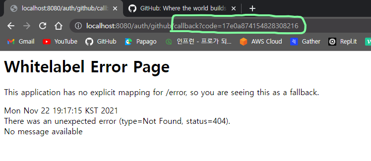 승인을 누르면 아래와 같이 Whitelabel Error Page가 나온다. 이때 URL을 확인해보면 우리가 아까 redirect_uri에 넣어준 URL 뒤로 code가 붙어서 왔다. 이 값이 우리가 다음에 사용할 값이다. 이제 첫 번째 단계가 끝났다.