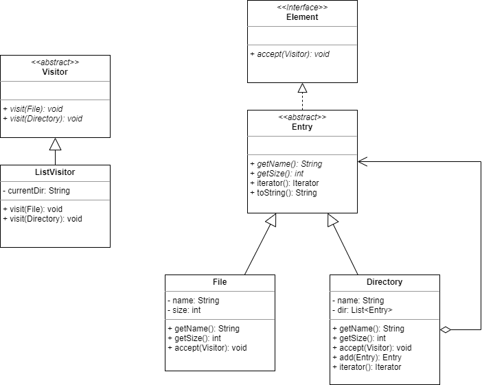 아래 예제에서는 ListVisitor만 생성해서 각 파일의 정보를 toString()으로 출력했지만 NameVisitor, SizeVisitor, 또는 이외에 각종 상태들에 대해 순회하는 Visitor를 만들어서 사용할 수도 있다.