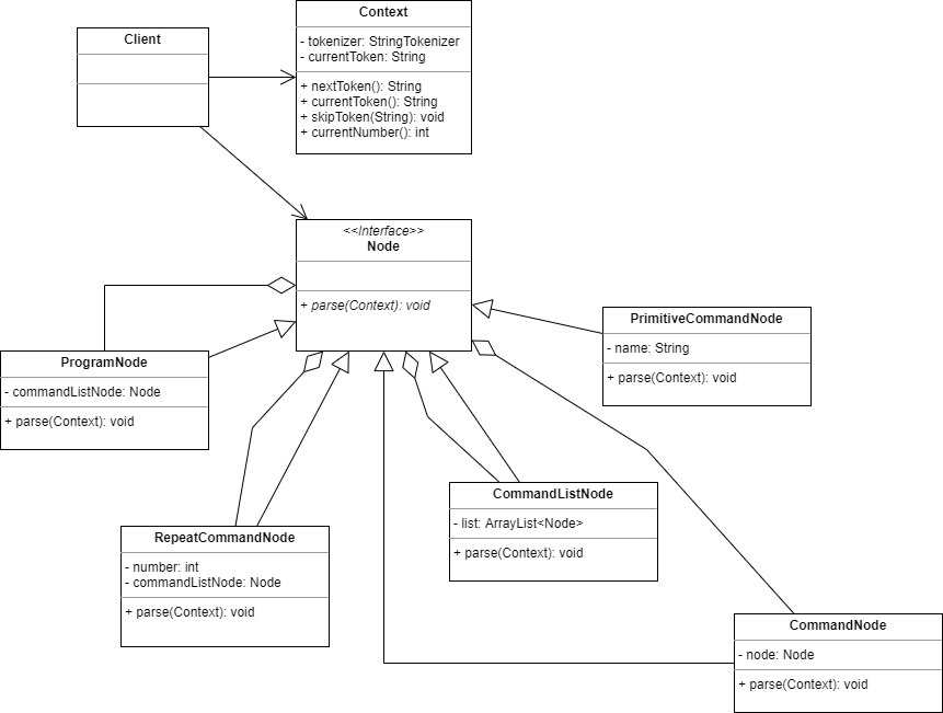 - 클라이언트는 Context에 문자열을 입력하고 ProgramNode.parse()를 해야 하는 책임이 있다.