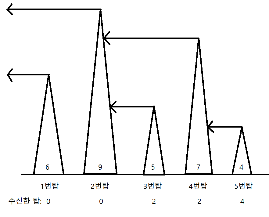 문제가 조금 장황한 것 같지만 핵심은 간단하다. 주어진 탑들이 마지막부터 반대 방향으로 레이저를 발사하는데 자신보다 높은 탑만 신호를 받을 수 있다. 즉, 마지막부터 자신보다 높은 가장 가까운 탑을 찾아내면 되는 것이다. 사이트 예제를 그림으로 설명하면 다음과 같다.