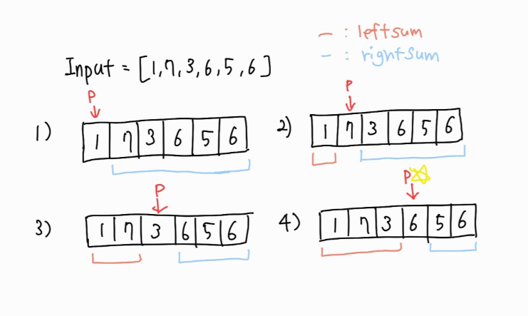 피봇 인덱스는 해당 인덱스를 기준으로 배열의 좌측의 합과 우측의 합이 같은 인덱스를 뜻한다. 이 피봇 인덱스를 구하면 된다.