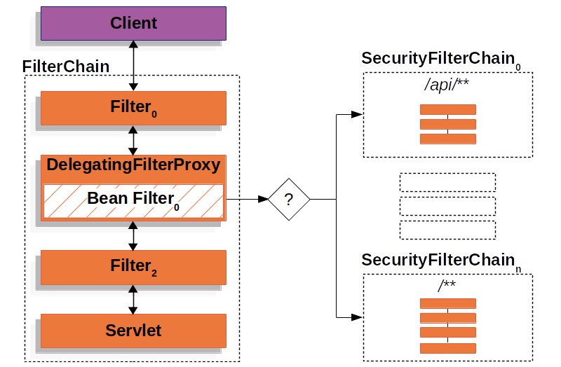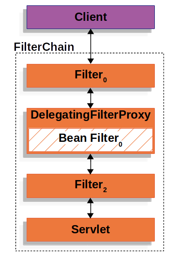 스프링 시큐리티는 프로그램이 실행될 때 하나의 필터를 추가한다. 이 필터는 DelegatingFilterProxy이다. 그리고 이 필터는 웹 요청을 받으면 내부에서 스프링 컨텍스트 내의 로직으로 요청을 위임한다. 이 필터에서는 내부에 필터를 구현한 빈이 등록되어 있고 이 빈이 요청을 처리한다.
