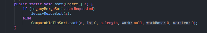 정렬 전 LegacyMergeSort.userRequested 라는 값으로 분기를 하는데 이는 자바 환경 변숫값인 -Djava.util.Arrays.useLegacyMergeSort=true 로 설정할 수 있다. 기본적으로는 false가 되며 Tim Sort가 동작한다.