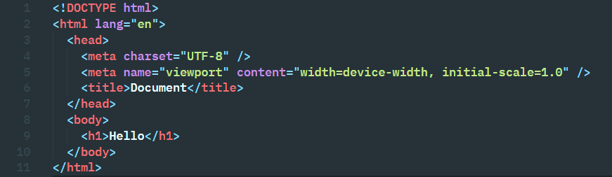 HTML 문서는 기본적으로 <html> ~ </html> 안에 작성되며, <head> 영역, <body> 영역으로 나누어져 있습니다. <head> 영역은 문자 형식, 브라우저에 대한 설명글 등 meta 태그로 브라우저에게 정보를 주거나 title과 같은 제목을 작성합니다.