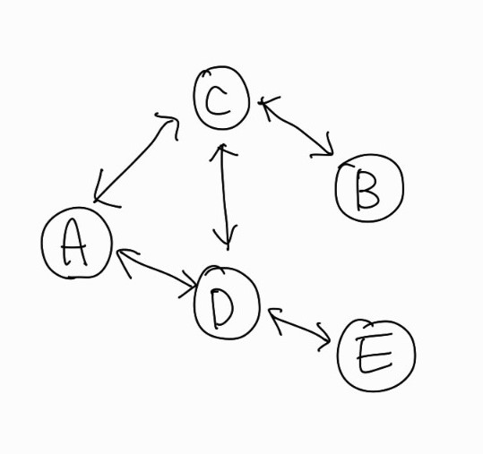A, B, C, D, E가 있고 A와 C, A와 D, B와 C, C와 D, D와 E가 친구인 경우를 생각해보자.