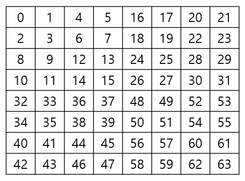 - 탐색할 위치가 3사분면인 경우 size * size / 4 * 2 를 해주어야 한다. 예를 들어 (5, 0) 를 탐색해야 한다고 하면 8x8 배열에서 31까지를 방문한 처리를 해야 하므로 현재 탐색 범위에서 4를 나누어 준 뒤 2를 곱한다. 즉, 8x8에서 1사분면, 2사분면을 빼는 것이다. 따라서 카운트를 8 * 8 / 4 * 2 = 32 를 카운트해서 3사분면으로 탐색할 범위를 정한다.