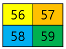 먼저 size를 절반으로 줄인다. 그리고 3사분면까지 방문 카운트를 계산해야 한다. 따라서 count = 48(기존값) + ( size * size / 4 ) * 2 = 48 + ( 4 * 4 / 4 ) * 2 = 48 + 8 = 56 으로 계산할 수 있다. 또한 3사분면에 대한 상대적인 위치값을 계산해야 하므로 r 값을 r - size / 2 처리해서 호출할 때 넘겨준다. 따라서 2x2 배열로 줄게 되며 size = 4 / 2 = 2, r = 2 - 4 / 2 = 0, c = 1 이 되며 함수 호출은 solve(2, 0, 1)가 된다.