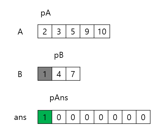 1이 더 작으므로 ans[0]에 1을 저장하고 pAns와 pB를 1씩 증가시킨다.
