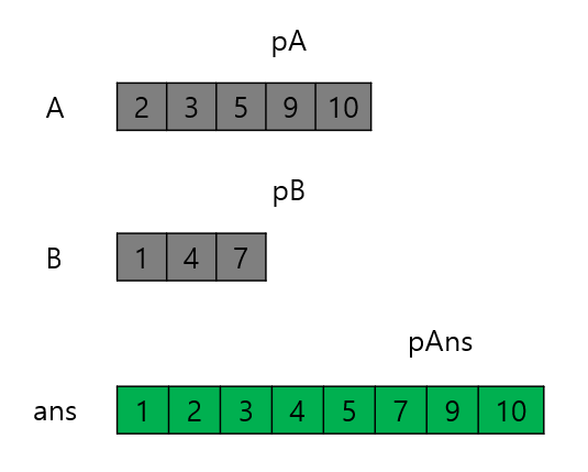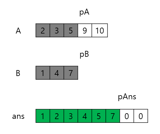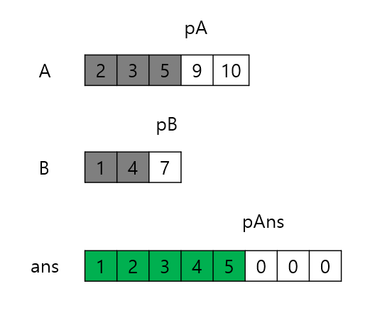 7이 더 작으므로 ans[5]에 7을 넣고 pAns와 pB를 증가시킨다. 그런데 이때 pB가 B의 배열 범위를 초과했다. 이 말은 B에는 더 비교할 원소가 없다는 뜻이다. 따라서 A의 나머지 원소들을 ans 배열의 뒤에 복사하기만 하면 된다. 이미 정렬된 배열로 주어지기 때문에 가능하다.