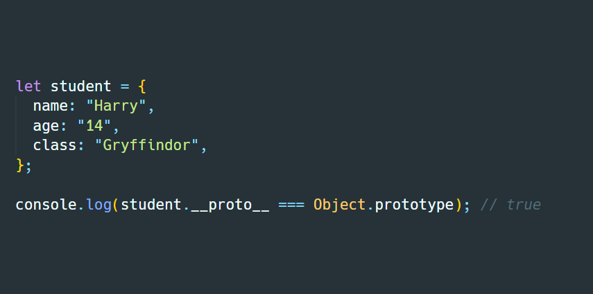 자바스크립트의 모든 객체는 [[Prototype]]이라는 내부 슬롯(internal slot)을 가집니다. 이 값은 null 또는 객체이며 상속을 구현하는데 사용됩니다. [[Prototype]]의 값은 Prototype Object이며 __proto__ 로 접근할 수 있습니다. __proto__ 프로퍼티에 접근하면 내부적으로 Object.getPrototypeOf가 호출되어 Prototype Object를 반환합니다. student Object는 __proto__ 프로퍼티로 자신의 부모 Prototype Object인 Object.prototype을 가리키고 있습니다.