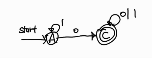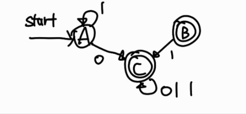 이 상태 전이도는 DFA로 바뀌어져 있지만 B 상태는 시작 상태로부터 도달 불가능한 상태이므로 문장을 인식하는데 불필요하다. 따라서 B 상태를 제거하고 다음과 같은 상태 전이도를 얻을 수 있다.