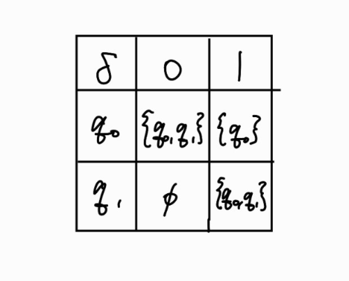 이때 NFA를 DFA로 변환해보자. DFA \(M^\prime = (Q^\prime, \sum , \delta ^\prime, q_0^\prime, F^\prime)\)라 하면 변환 알고리즘에 의해 다음과 같이 된다.
