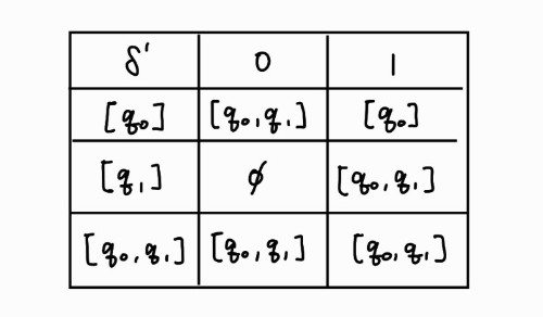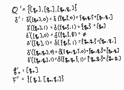 - \(Q^\prime = 2^Q\), 즉 \(Q^\prime\)의 한 상태는 \([q_1, q_2, \cdots , q_i]\)의 형태로 나타낸다. 단, \(q_j \in Q(j=1, 2, \cdots , i\)이다.