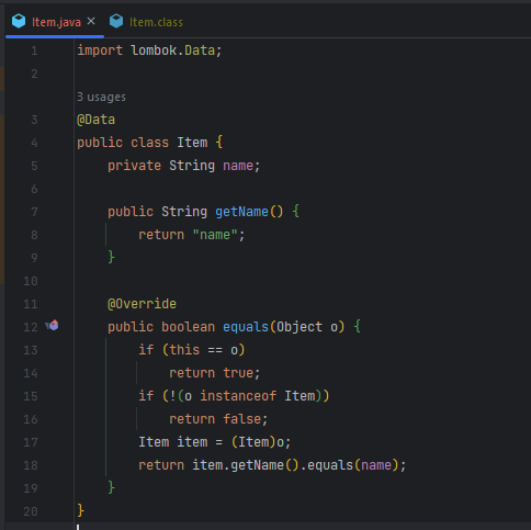E:\LombokTest\src\main\java\Item.java:3: warning: Not generating hashCode: One of equals or hashCode exists. You should either write both of these or none of these (in the latter case, lombok generates them). @Data
