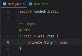 Item이라는 클래스를 만들고 @Data를 선언했다. 참고로 @Data는 @Getter, @Setter, @RequiredArgsConstructor, @ToString, @EqualsAndHashCode를 묶어놓은 애너테이션이다.