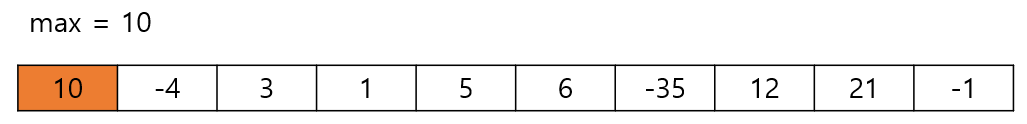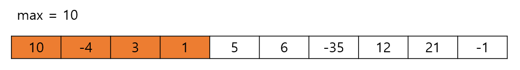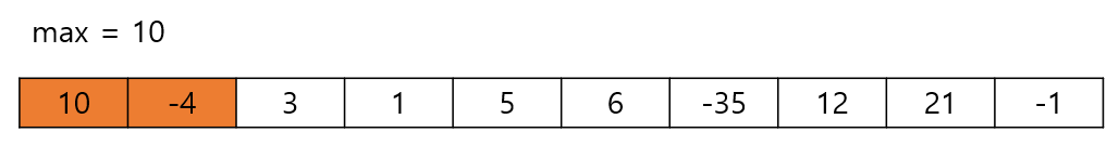 그 다음 수인 -4와 더하면 10 + (-4) = 6이 된다. 이 값은 10보다 작으므로 max는 갱신되지 않는다.