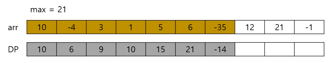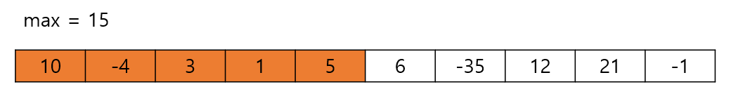 그 다음 수인 5를 더해보자. 10 + (-4) + 3 + 1 + 5 = 15 이므로 max보다 크다. 따라서 max를 15로 갱신한다.