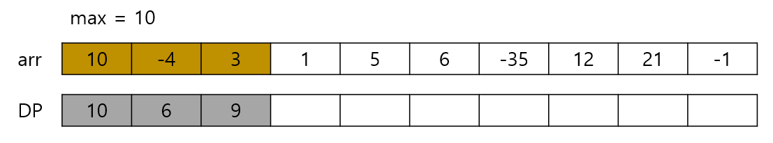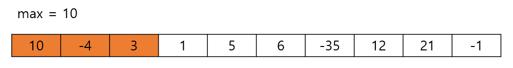 그 다음 수인 3을 더해보자. 10 + (-4) + 3 = 9 이므로 max보다 작다. 따라서 갱신되지 않는다.