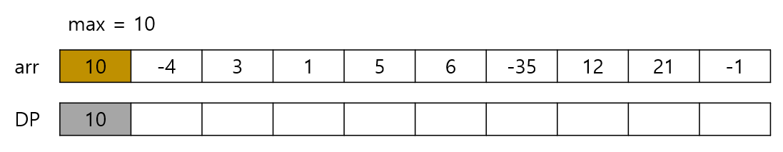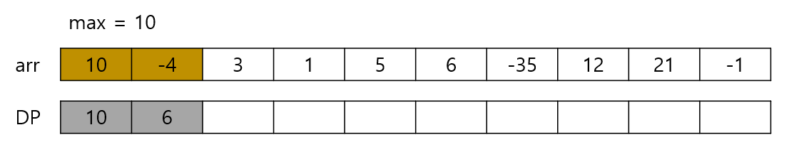 10에 -4를 더하면 6이 된다. 이 값과 현재 값인 -4와 비교하면 6이 더 크다. 이 값을 DP 배열에 저장하는 것이다.