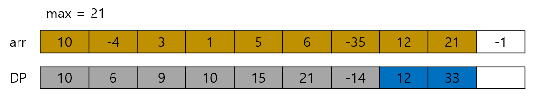 그 다음 12 + 21 = 33이고 12보다 크므로 DP에 33을 저장한다. 그리고 max가 33보다 작으므로 max도 갱신한다.