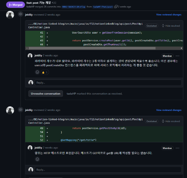 - 팀원 간 PR에 대해 코드 리뷰를 하면서 클린 코드에 대해 고민하는 시간을 가졌다.