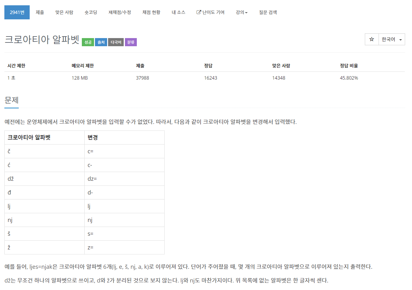 replaceFirst를 쓴 이유는 혹시나 문자열에 포함된 크로아티아 알파벳이 여러 개인데 한꺼번에 모두 치환돼서 카운트를 하지 못할까봐 replaceFirst를 사용했습니다.