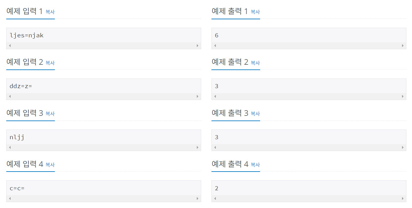문제를 이해하는 것부터 난관이었어요 ㅠㅜ 기존 알파벳에 크로아티아 알파벳이 추가된 것이고 여러 문자로 이루어져 있으니 그 문자들을 하나로 보고 입력받은 문자열의 알파벳 개수를 세면 되는 것이었습니다.