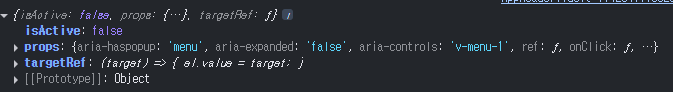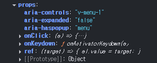 이 코드에서는 v-menu 가 슬롯을 사용하는 컴포넌트이고 내부에서 slotProps를 #activator에서 사용할 수 있게 전달해준다. {prop}로 작성한 구문은 구조분해할당 문법으로 slotProps로 전달받은 값들 중 props만 빼낸 것이다. 실제 slotProps를 보면 다음과 같다.
